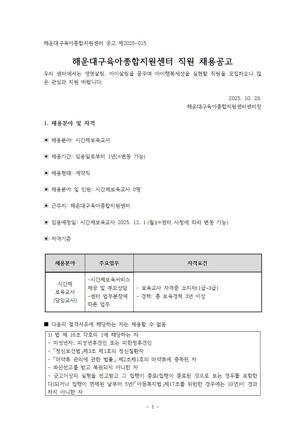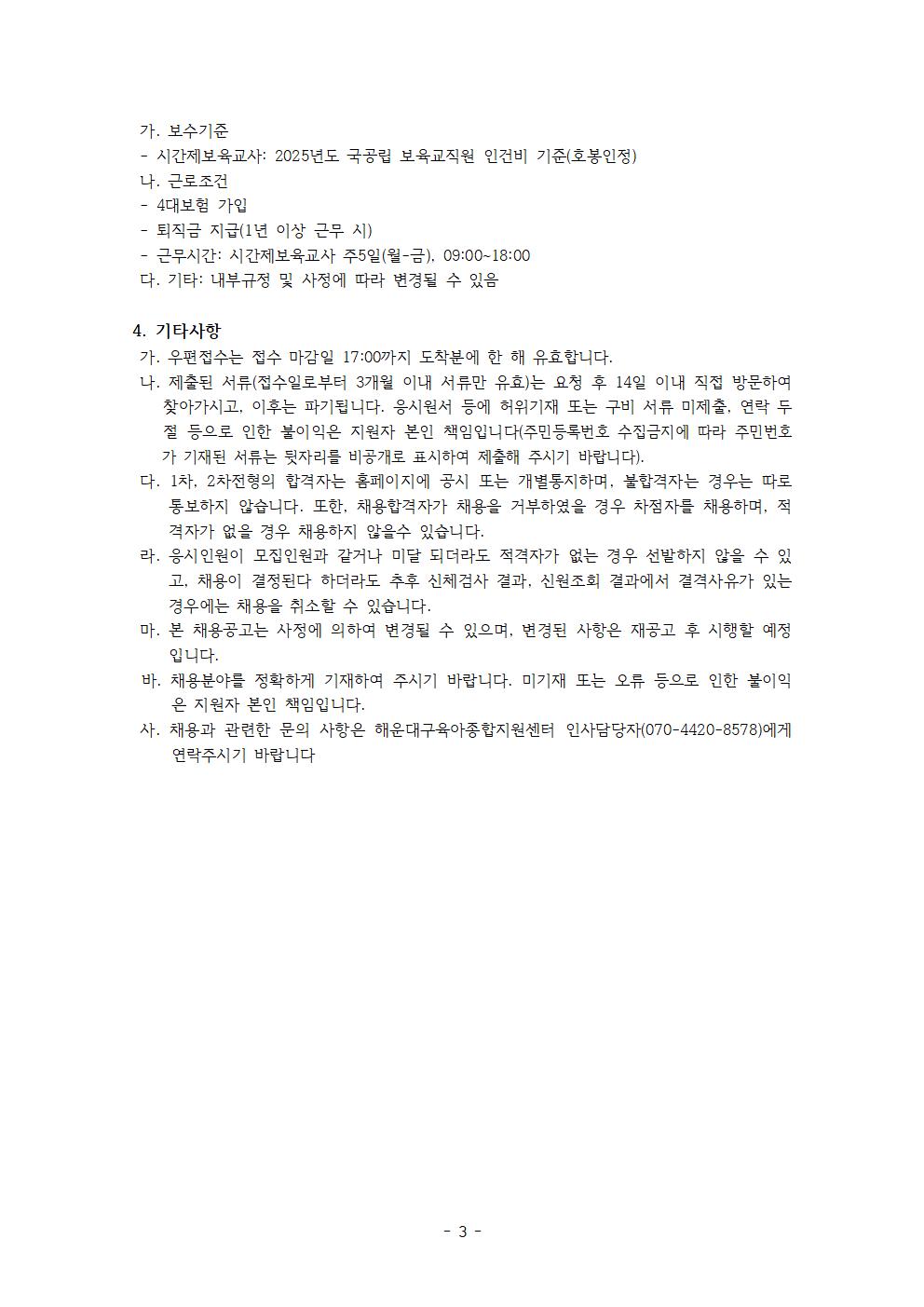 [ä¿ë]ÇØ¿î´ë±¸À°¾ÆÁ¾ÇÕÁö¿ø¼¾ÅÍ ½Ã°£Á¦ º¸À°±³»ç ä¿ë °ø°í