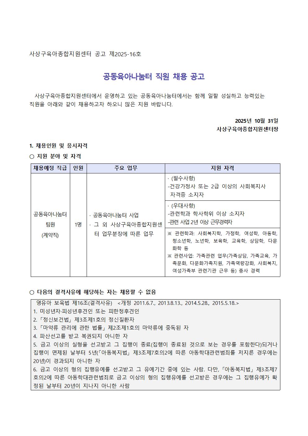 [ä¿ë] »ç»ó±¸À°¾ÆÁ¾ÇÕÁö¿ø¼¾ÅÍ °øµ¿À°¾Æ³ª´®ÅÍ Á÷¿ø ä¿ë °ø°í