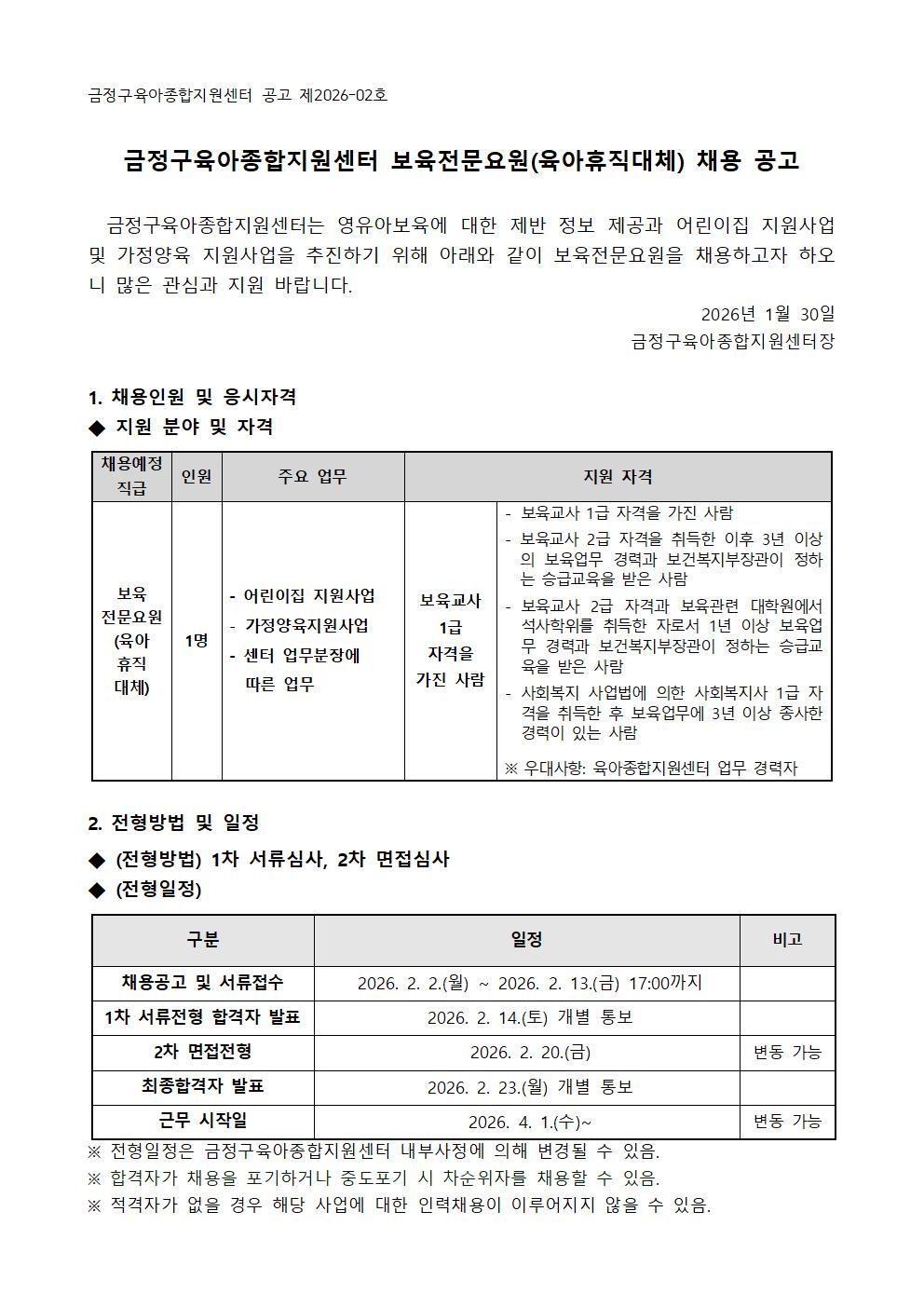 [ä¿ë]±ÝÁ¤±¸À°¾ÆÁ¾ÇÕÁö¿ø¼¾ÅÍ º¸À°Àü¹®¿ä¿ø(À°¾ÆÈÞÁ÷ ´ëü) ä¿ë °ø°í