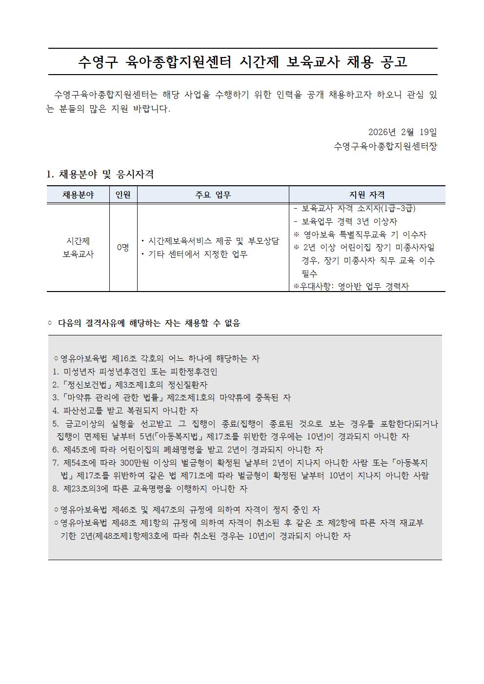 [ä¿ë] ¼ö¿µ±¸À°¾ÆÁ¾ÇÕÁö¿ø¼¾ÅÍ Á÷¿ø(½Ã°£Á¦ º¸À°±³»ç) ä¿ë °ø°í