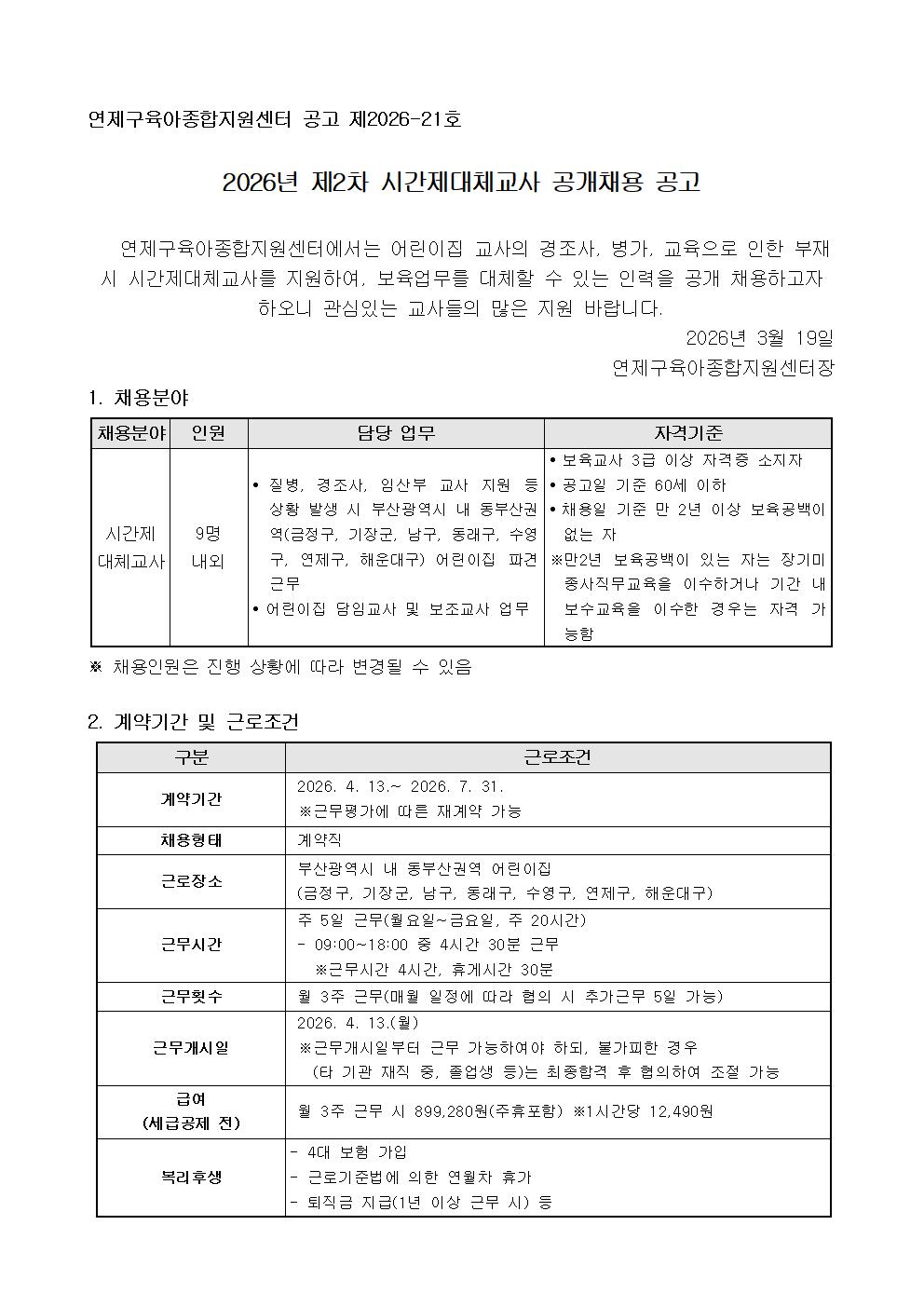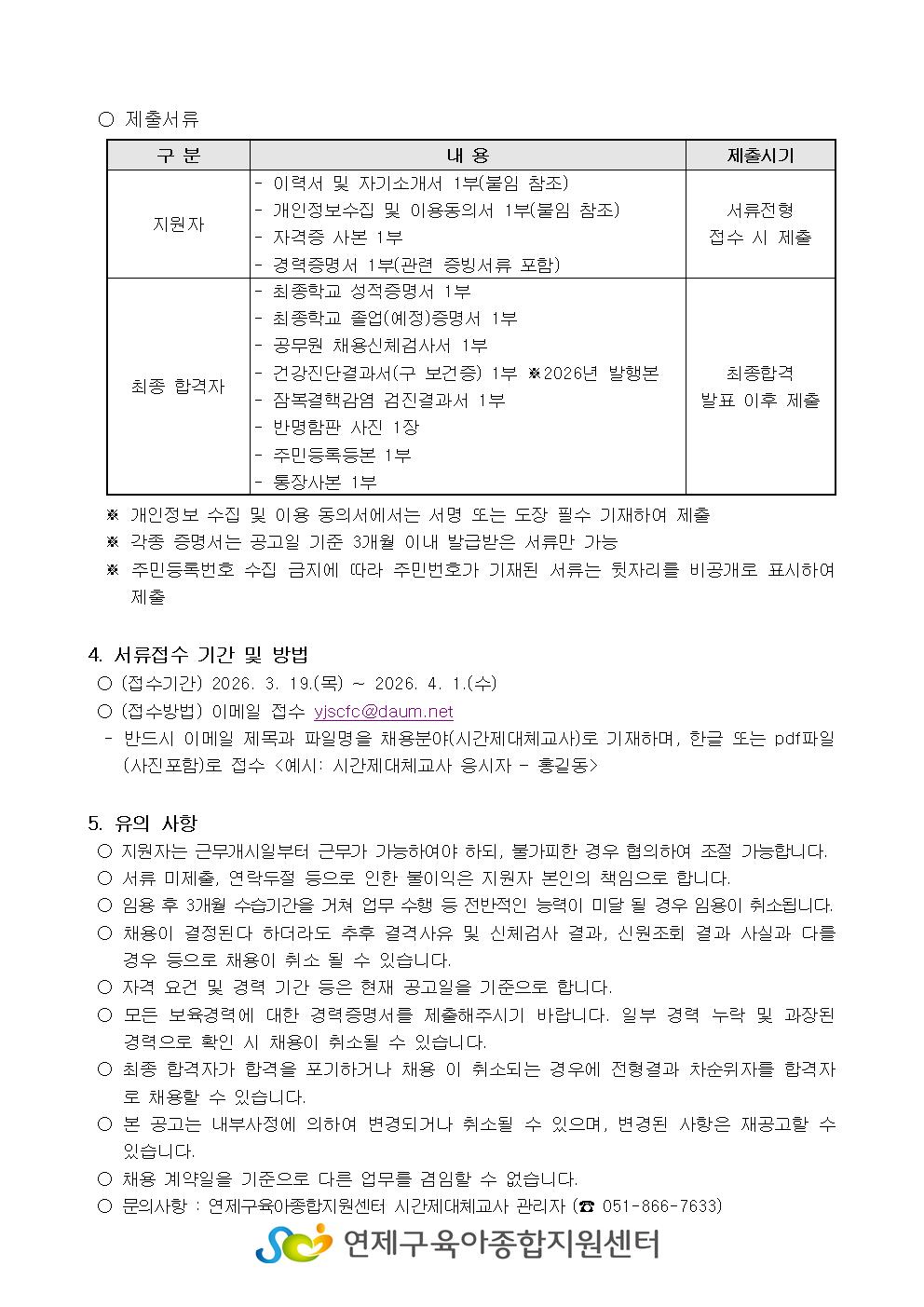 [ä¿ë] ¿¬Á¦±¸À°¾ÆÁ¾ÇÕÁö¿ø¼¾ÅÍ Á¦2Â÷ ½Ã°£Á¦´ëü±³»ç °ø°³Ã¤¿ë °ø°í