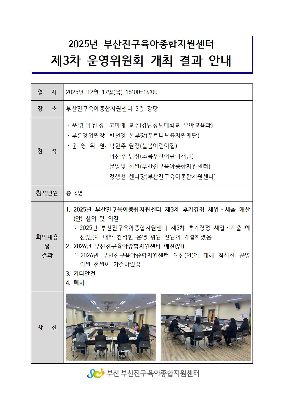 [¿î¿µ] 2025³â ºÎ»êÁø±¸À°¾ÆÁ¾ÇÕÁö¿ø¼¾ÅÍ Á¦3Â÷ ¿î¿µÀ§¿øÈ¸ °á°ú ¾È³»