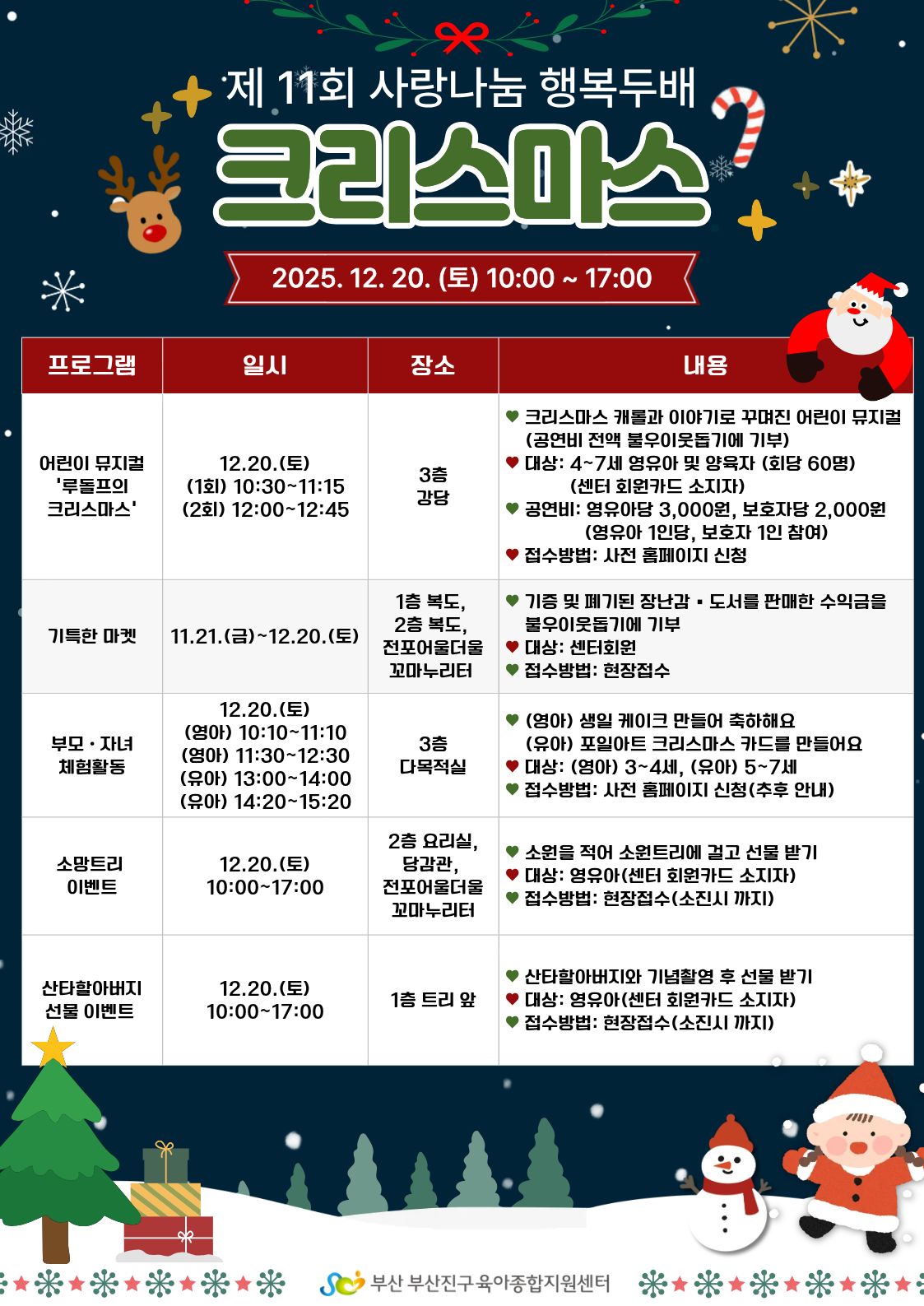 Á¦ 11ȸ »ç¶û³ª´® ÇູµÎ¹è 🎄Å©¸®½º¸¶½º Çà»ç🎄¸¦ ÁøÇàÇÕ´Ï´Ù🥰ÀÚ³àµé°ú ÇÔ²² Áñ±æ ¼ö ÀÖ´Â ¸¹Àº Çà»ç°¡ ÁøÇàµÉ ¿¹Á¤ÀÌ¿À´Ï º»¹®ÀÇ »çÁøÀ» Âü°íÇÏ½Ã¾î ¸¹Àº Âü¿© ¹Ù¶ø´Ï´Ù❤💚 🫎¾î¸°À̹ÂÁöÄà '·çµ¹ÇÁÀÇ Å©¸®½º¸¶½º‘ 🚗±âƯÇÑ ¸¶ÄÏ-Àå³°¨ ¹× µµ¼ÆÇ¸Å(¼öÀͱÝÀº ±âºÎ) 🎉ºÎ¸ð-ÀÚ³àüÇèȰµ¿ 🎂’»ýÀÏÄÉÀÌÅ©¸¦ ¸¸µé¾î ÃàÇÏÇØ¿ä‘ 💌’Æ÷ÀÏ¾ÆÆ® Å©¸®½º¸¶½º Ä«µå¸¦ ¸¸µé¾î¿ä‘ 🧞¡Î️¼Ò¸ÁÆ®¸®À̺¥Æ®-¼Ò¿øÀ» Àû¾î ¼Ò¿øÆ®¸®¿¡ °É°í ¼±¹°¹Þ±â🧣 🎅🏻»êŸÇҾƹöÁö ¼±¹° À̺¥Æ®-»êŸÇҾƹöÁö¿Í ±â³äÃÔ¿µ ÈÄ ¼±¹°¹Þ±â 🙏 ¼¾ÅÍȸ¿øÀ» ´ë»óÀ¸·Î ÁøÇàÇϴ Ȱµ¿ÀÌ ¸¹À¸´Ï,