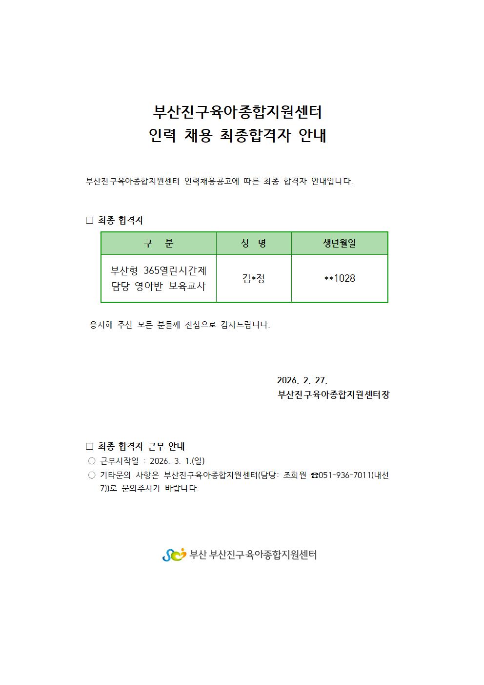 [°ø°í] ºÎ»êÁø±¸À°¾ÆÁ¾ÇÕÁö¿ø¼¾ÅÍ ºÎ»êÇü365¿¸°½Ã°£Á¦ º¸À°±³»ç ä¿ë ÃÖÁ¾ÇÕ°ÝÀÚ ¾È³»