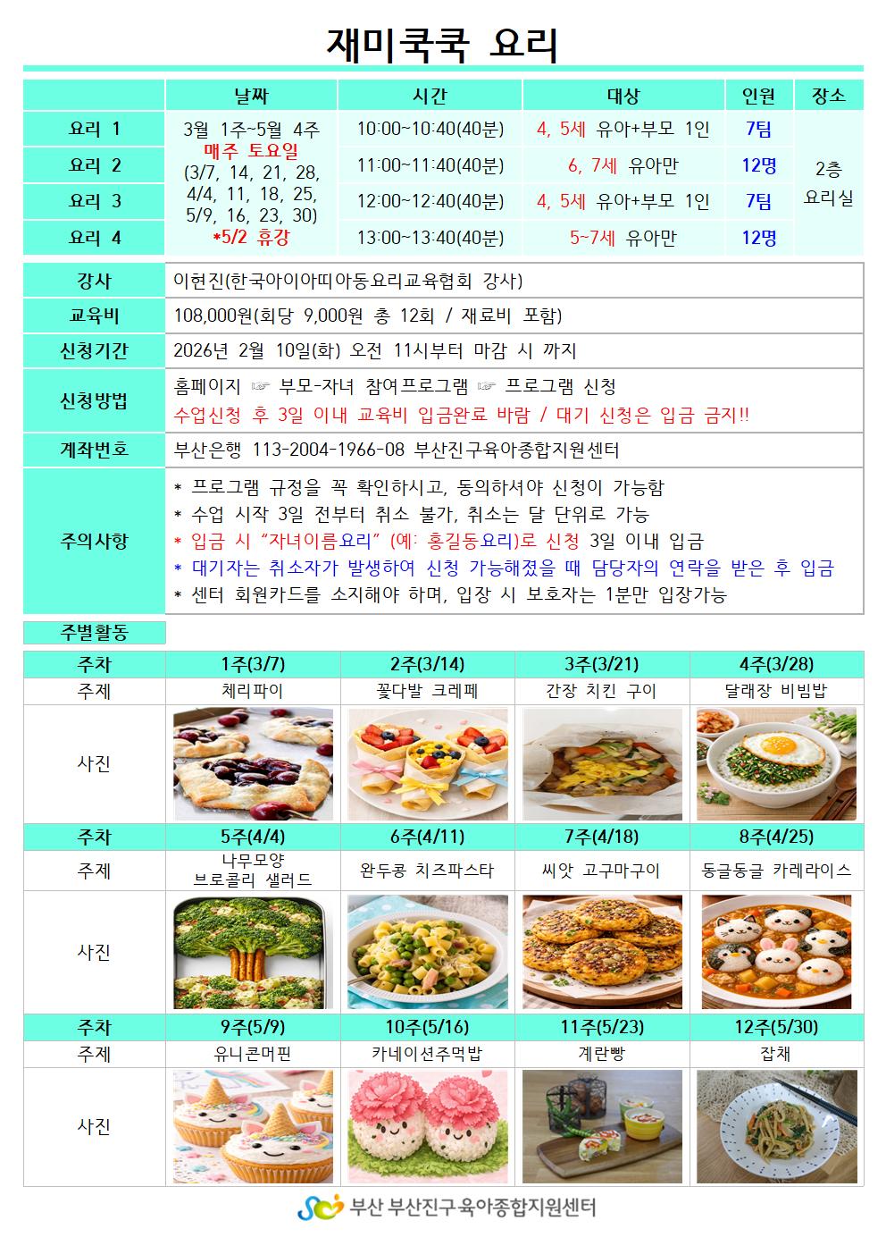 | ±âŸ»çÇ× | * ÇÁ·Î±×·¥ ±ÔÁ¤À» ²À È®ÀÎÇϽðí, µ¿ÀÇÇÏ¼Å¾ß ½ÅûÀÌ °¡´ÉÇÔ * ¼ö¾÷ ½ÃÀÛ 3ÀÏ ÀüºÎÅÍ Ãë¼Ò ºÒ°¡, Ãë¼Ò´Â ´Þ ´ÜÀ§·Î °¡´É * ÀÔ±Ý ½Ã ¡°ÀÚ³àÀ̸§¿ä¸®¡± (¿¹: È«±æµ¿¿ä¸®)·Î ½Åû 3ÀÏ À̳» ÀÔ±Ý * ´ë±âÀÚ´Â Ãë¼ÒÀÚ°¡ ¹ß»ýÇÏ¿© ½Åû °¡´ÉÇØÁ³À» ¶§ ´ã´çÀÚÀÇ ¿¬¶ôÀ» ¹ÞÀº ÈÄ ÀÔ±Ý * ¼¾ÅÍ È¸¿øÄ«µå¸¦ ¼ÒÁöÇØ¾ß Çϸç, ÀÔÀå ½Ã º¸È£ÀÚ´Â 1ºÐ¸¸ ÀÔÀå°¡´É |