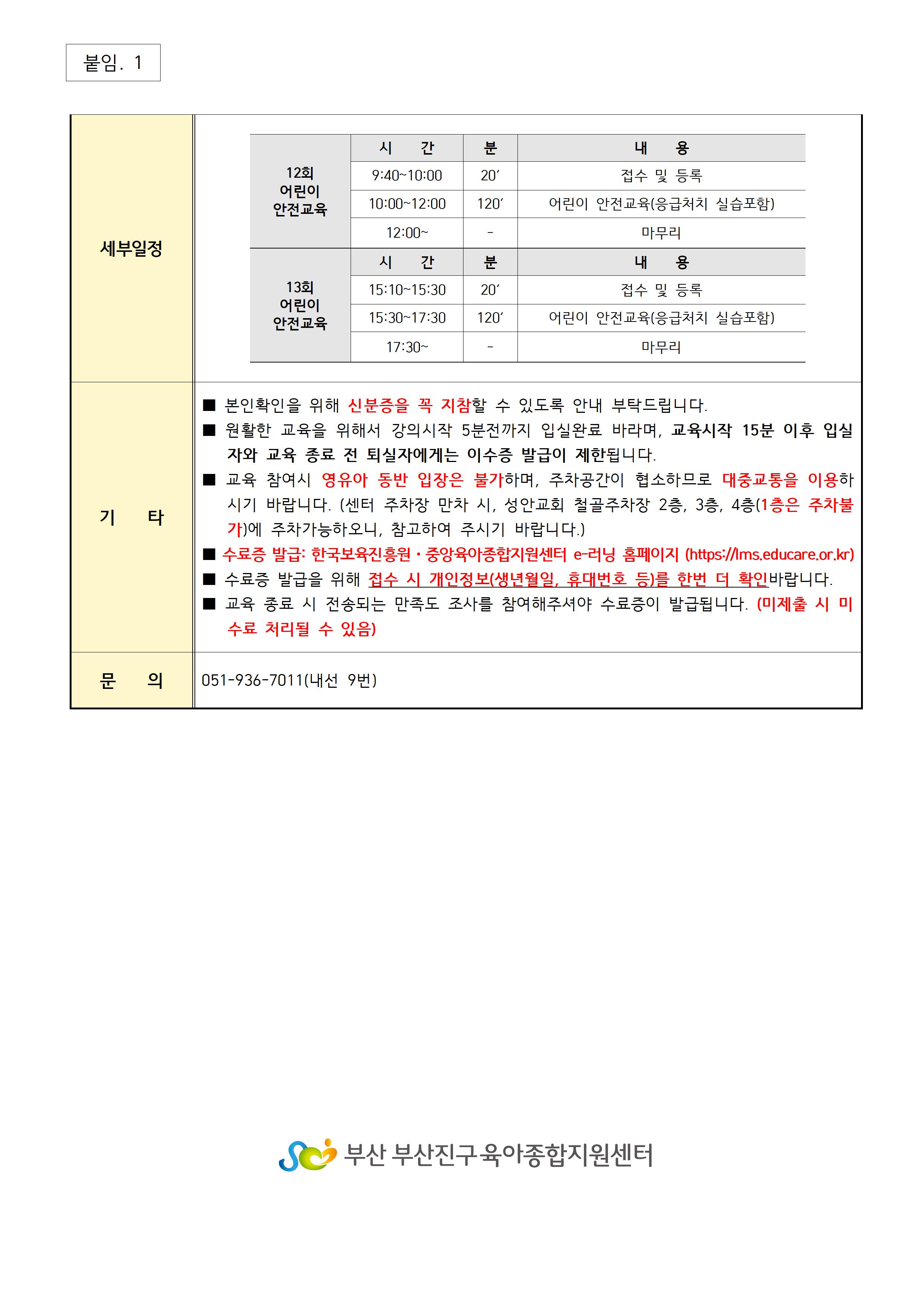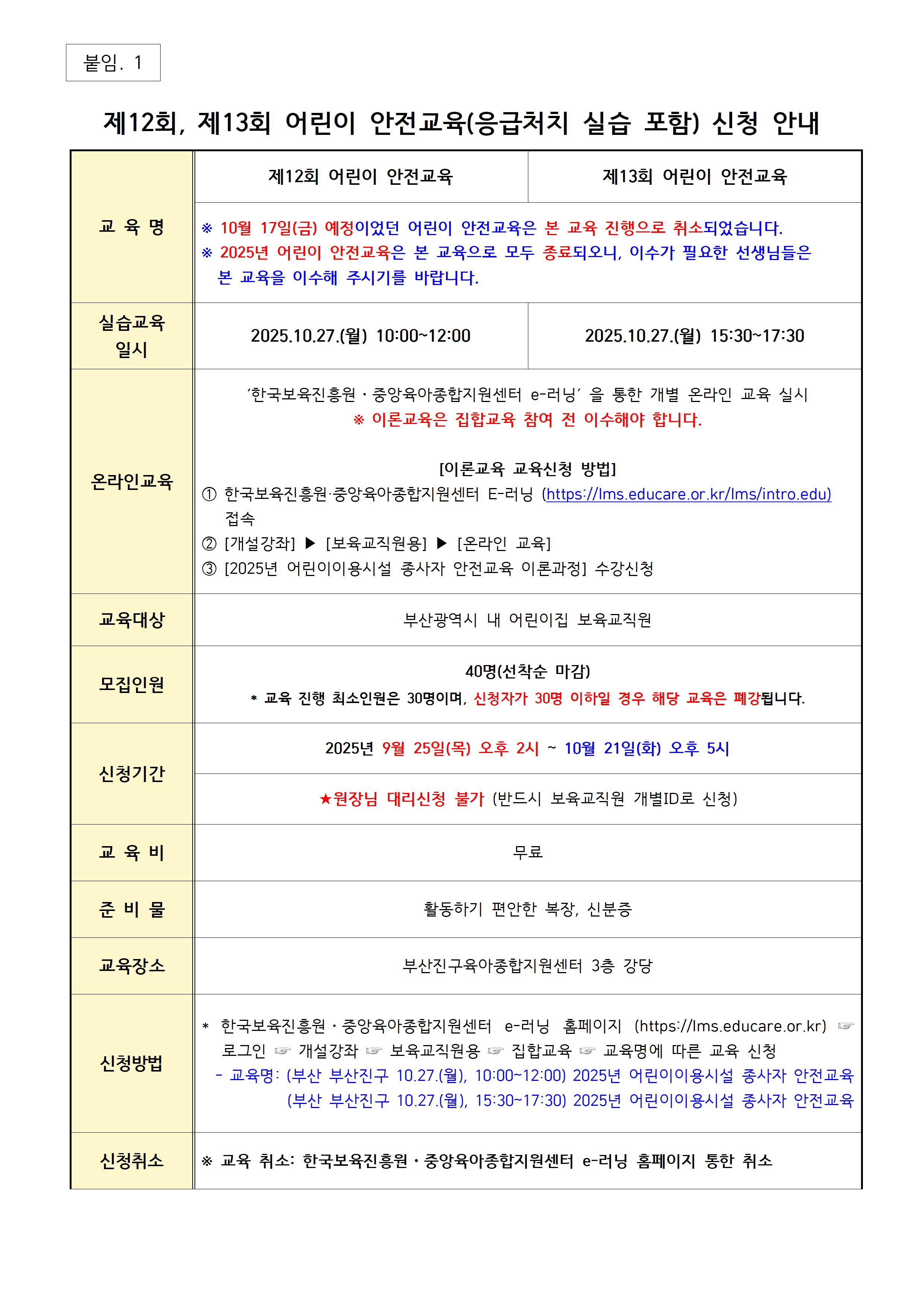 [¾ÈÀü±³À°] Á¦12ȸ, Á¦ 13ȸ ¾î¸°ÀÌ ¾ÈÀü±³À°(ÀÀ±Þóġ½Ç½À Æ÷ÇÔ) - ±³À° ÀÏÁ¤ ¹× ½Åû±â°£ º¯°æ | |||