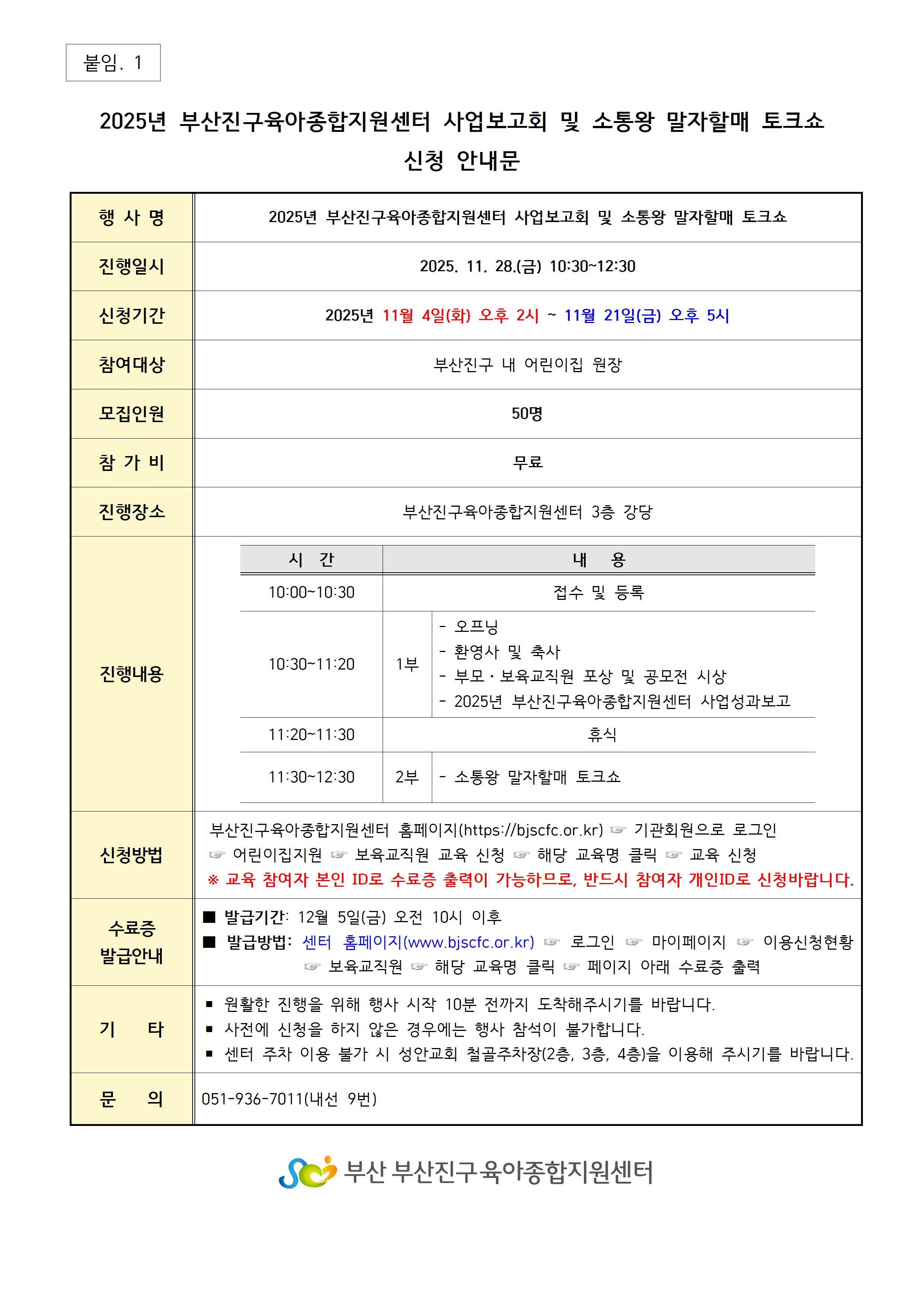 | 2025³â ºÎ»êÁø±¸À°¾ÆÁ¾ÇÕÁö¿ø¼¾ÅÍ »ç¾÷º¸°íȸ ¹× ¼ÒÅë¿Õ ¸»ÀÚÇҸŠÅäÅ©¼î | |||